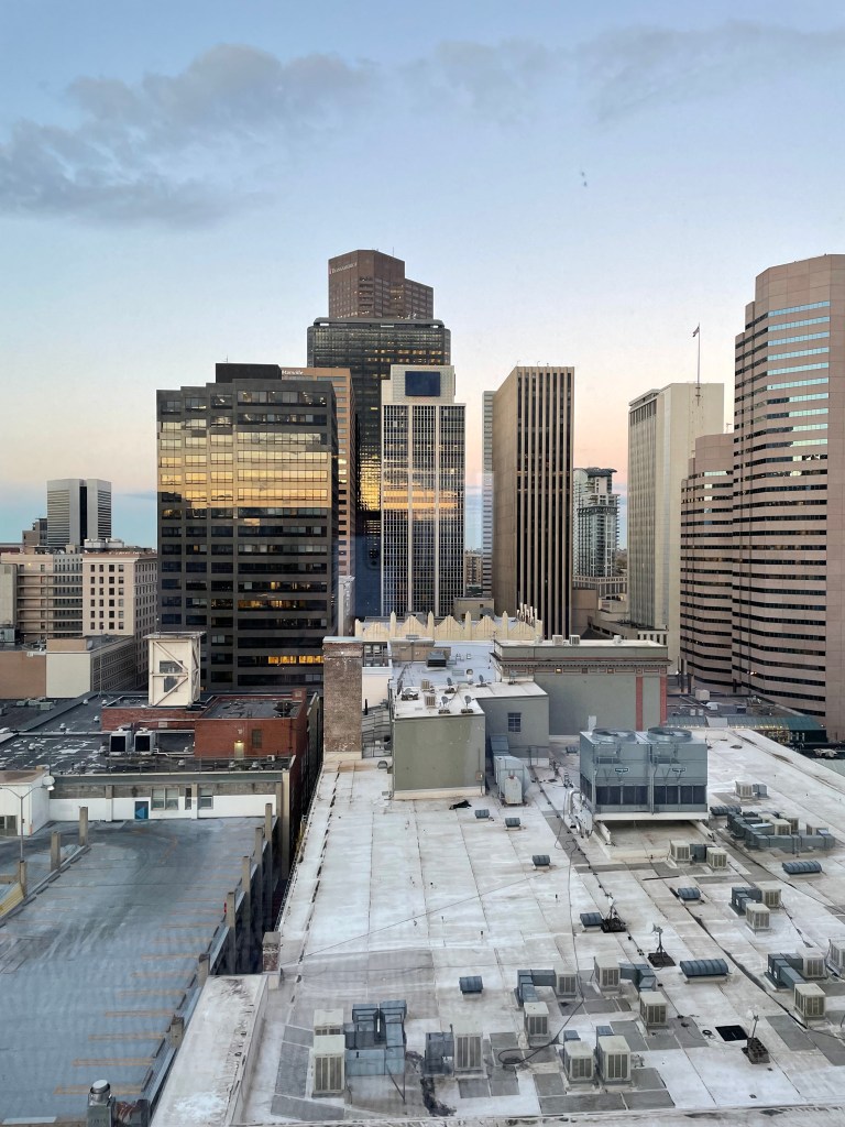 - we checked into our hotel after spending some time at the mall. we were situated near the central part of downtown Denver, and our room had a great view of the city and mountains. we could easily walk to restaurants and bars within the vicinity, but aside from that, you’ll probably want a car.